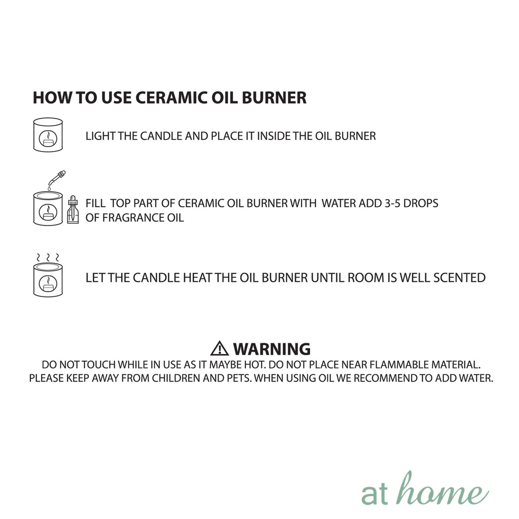 INSTRUCTIONS: First light a tealight candle in the holder. Then simply fill the bowl with water and put a 3-5 drops of essential oil into it. Then let the candle heat the oil until the room is well scented. Our narrower and deeper bowl will naturally increase the burning time of the oil.