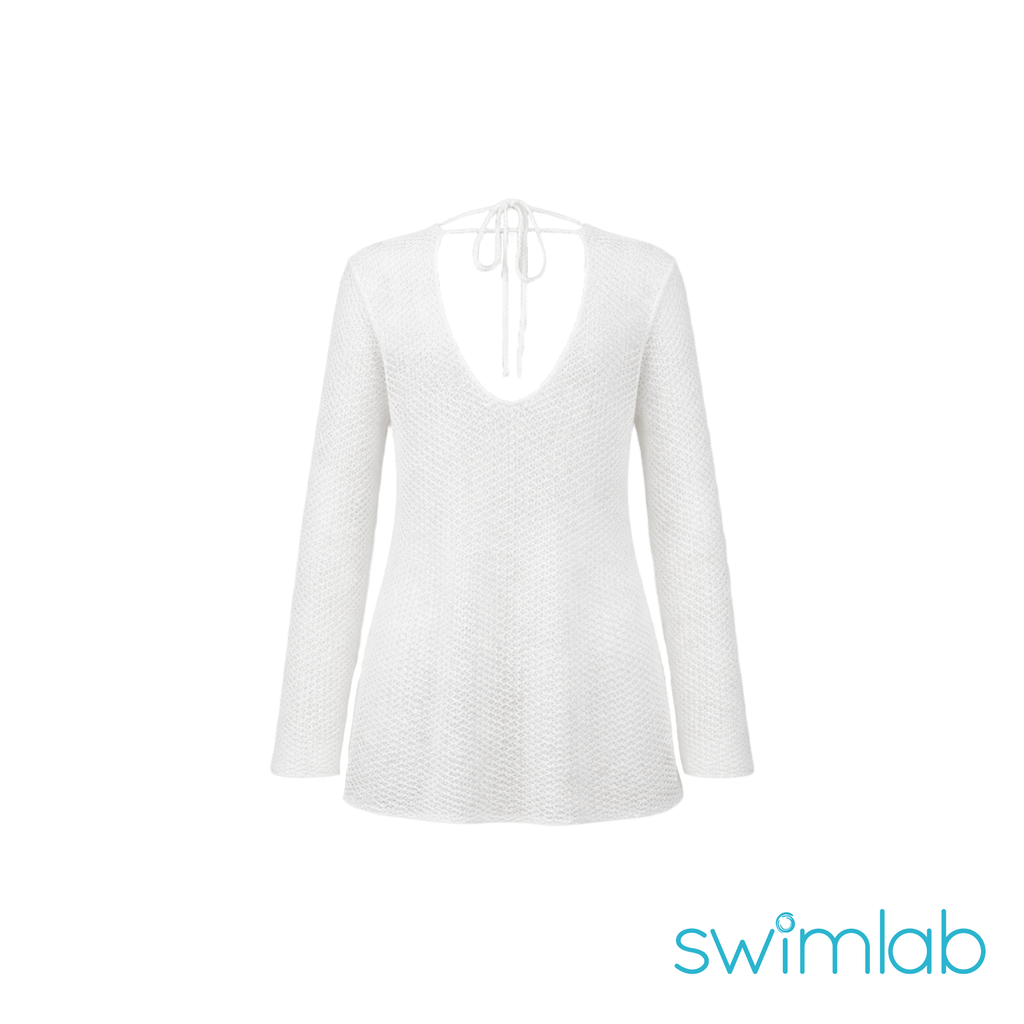 The Long-Sleeved Short Dress Cover-Up combines comfort and effortless elegance. Featuring a boat neck, long sleeves, and a scoop back with tie, it’s perfect for layering over your Swimlab favorites for sun-ready days.