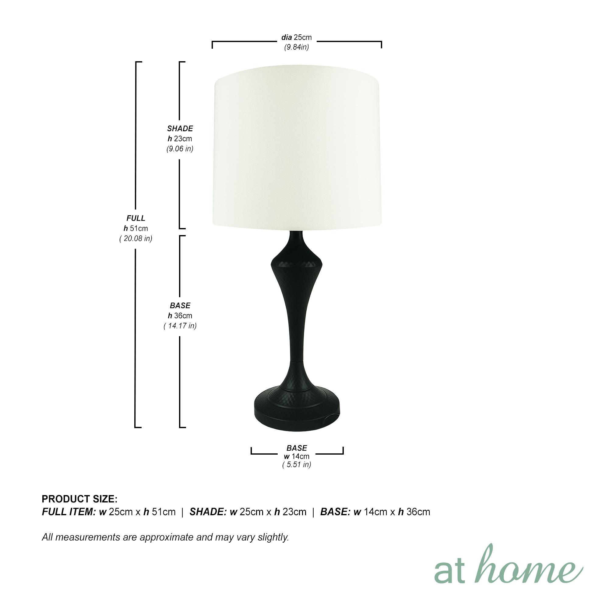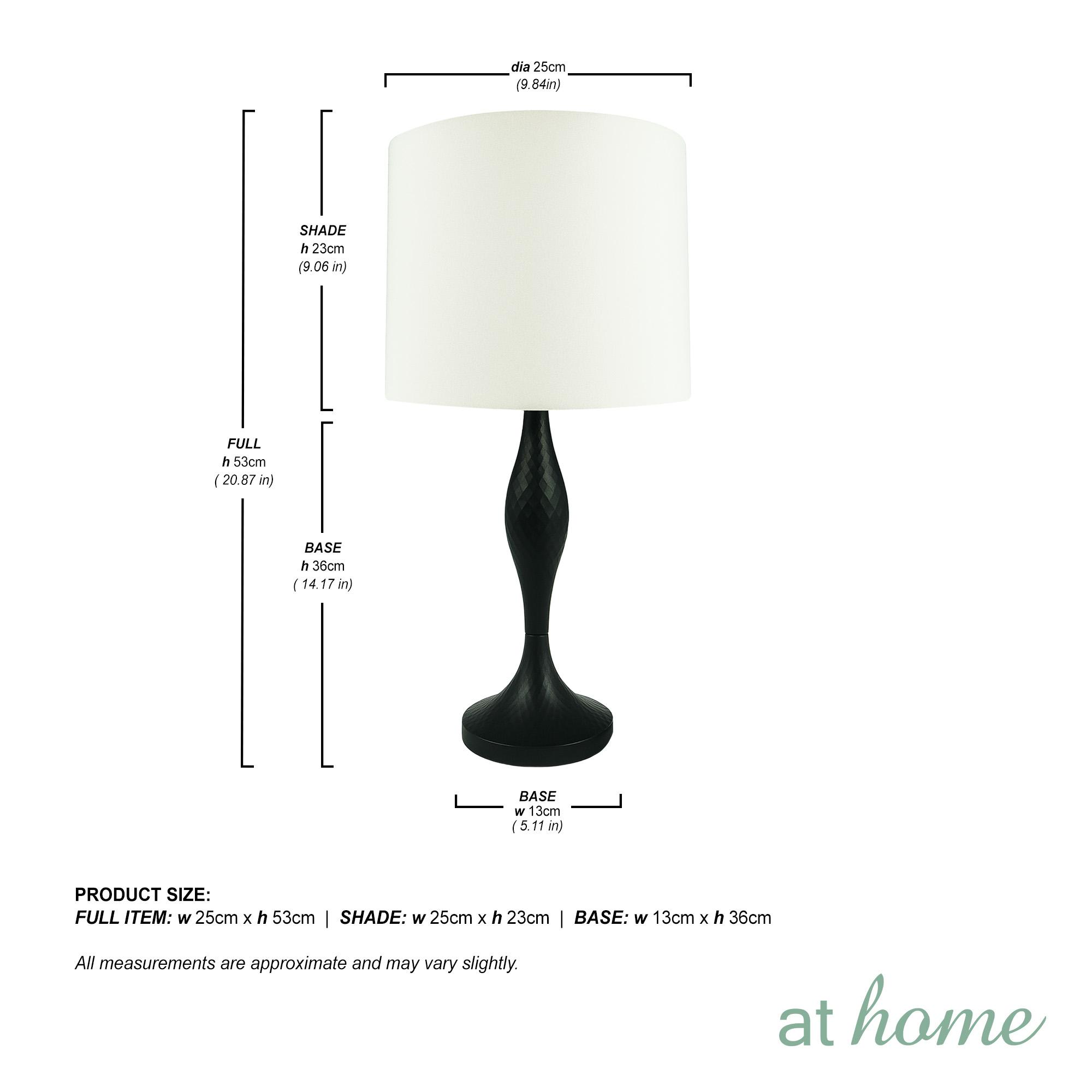 The lamp measures 21 inches (53.5 cm) in height and the shade’s diameter is 9.8 inches (25 cm). Available in color Black