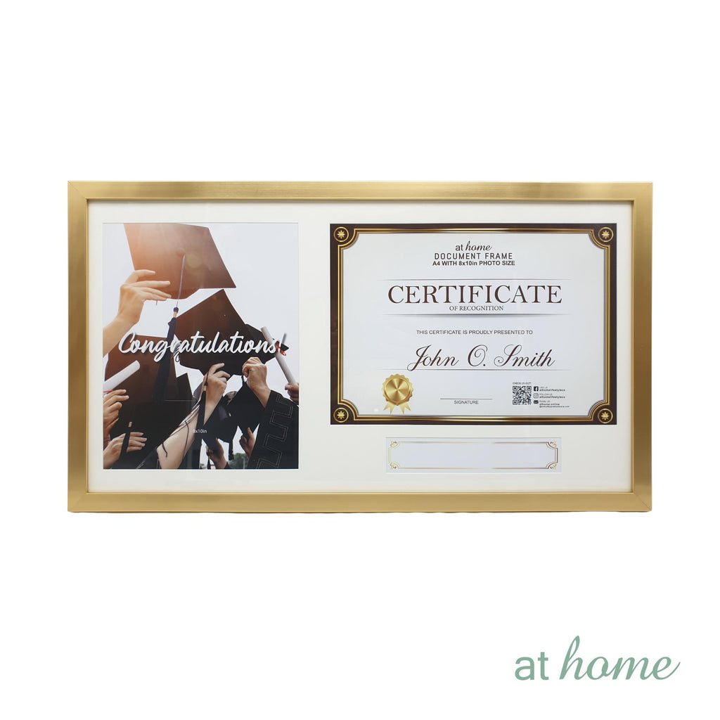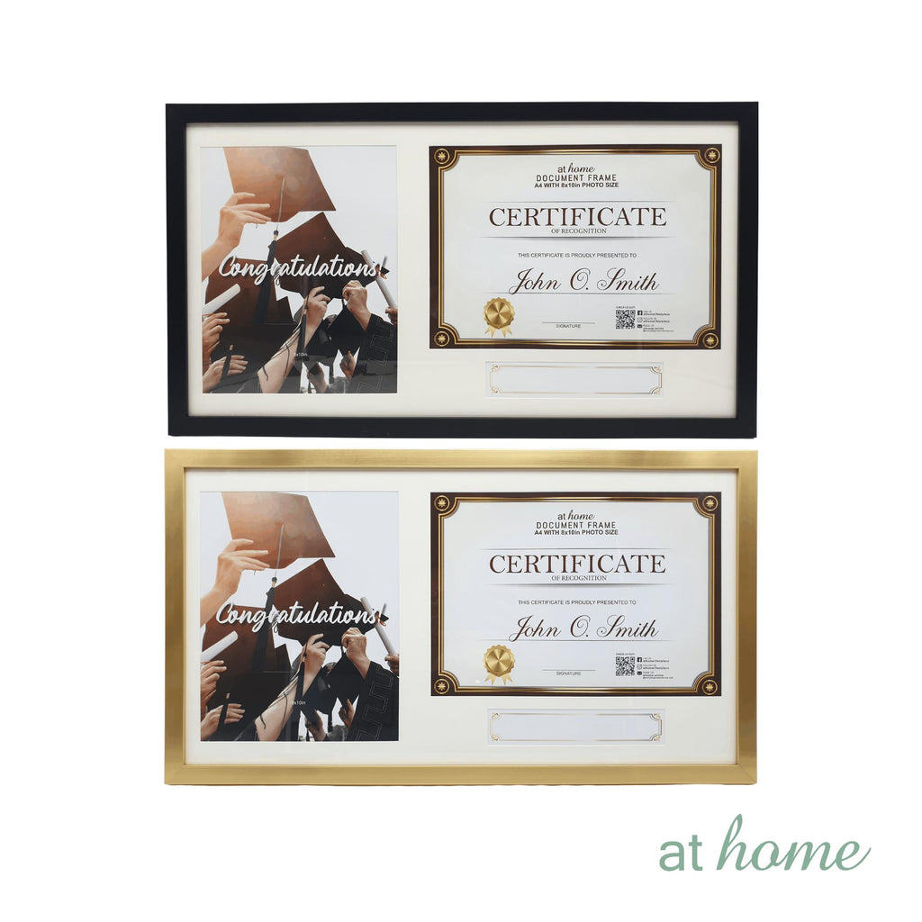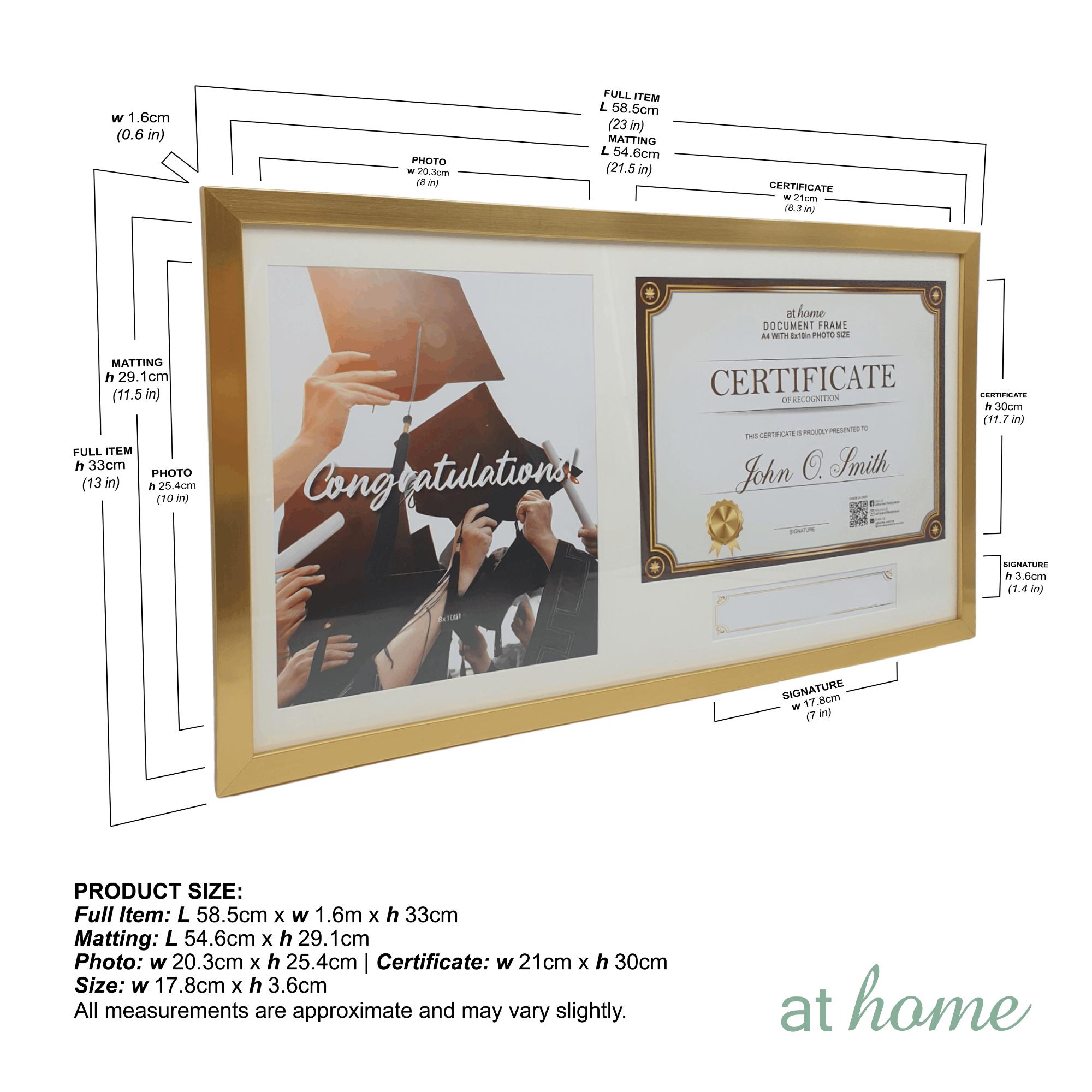JELINA CERTIFICATE FRAME: Outer frame size is 23 x 1.6 x 13 in (58.5 x 1.6 x 33 cm). Matting size is 21.5 x 17.5 in (54.6 x 29.1 cm). Photo Opening of 8x10 in (20.3 x 25.4 cm). Certificate slot of 8 x 11 in (21 x 30 cm). The frame comes in Black or Gold