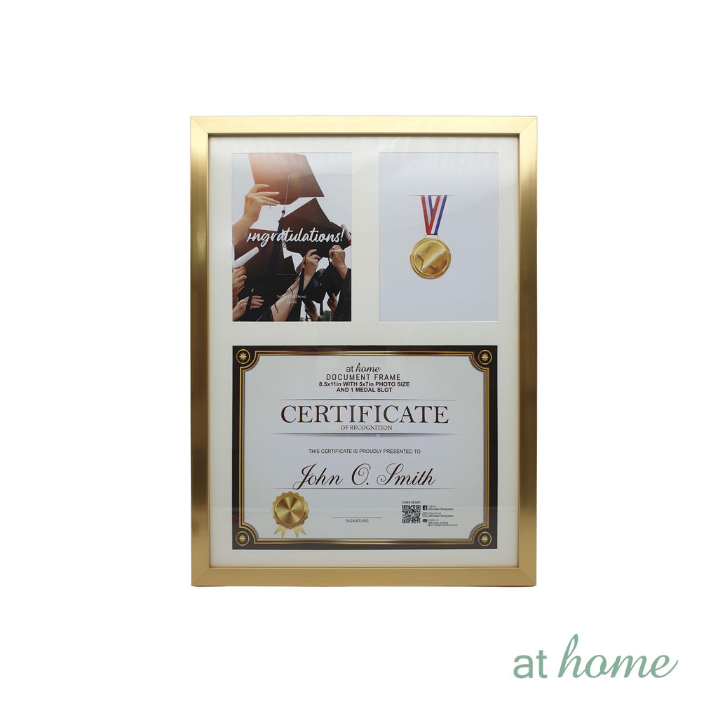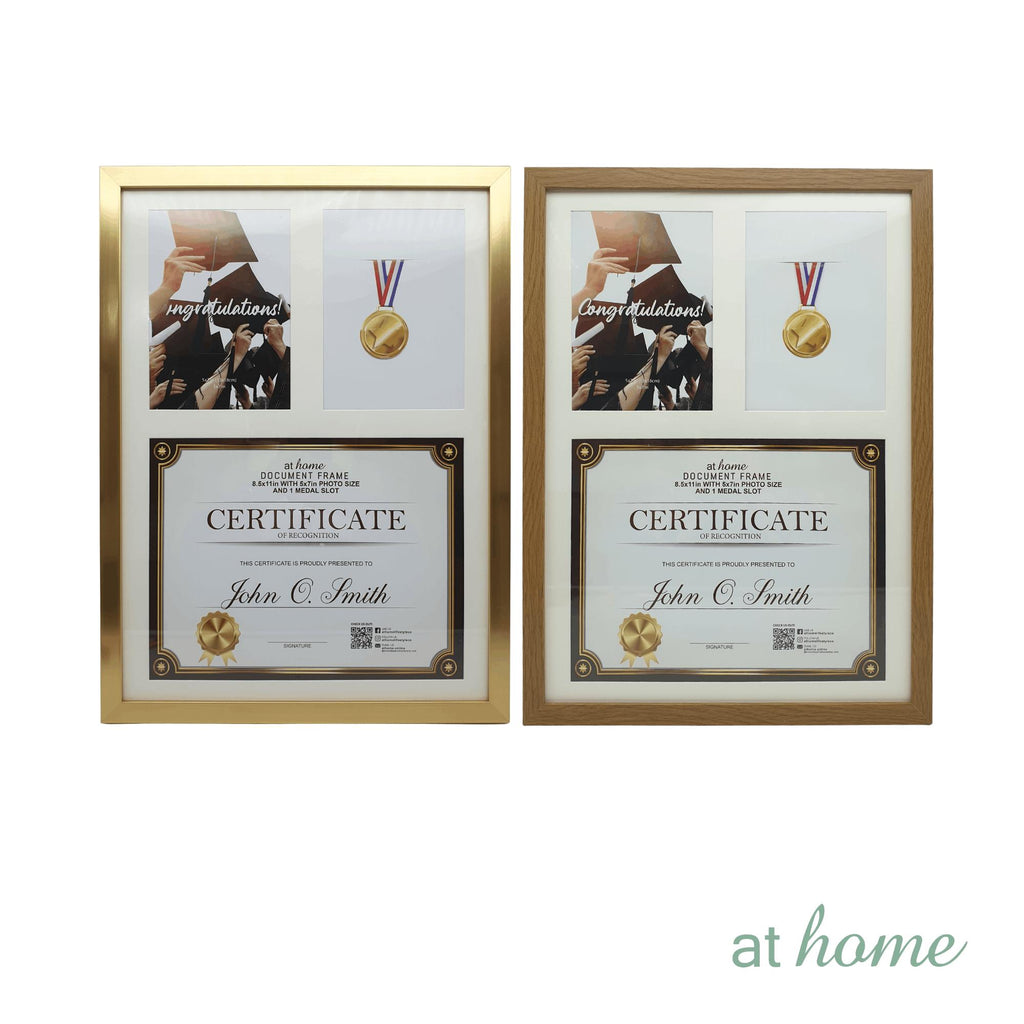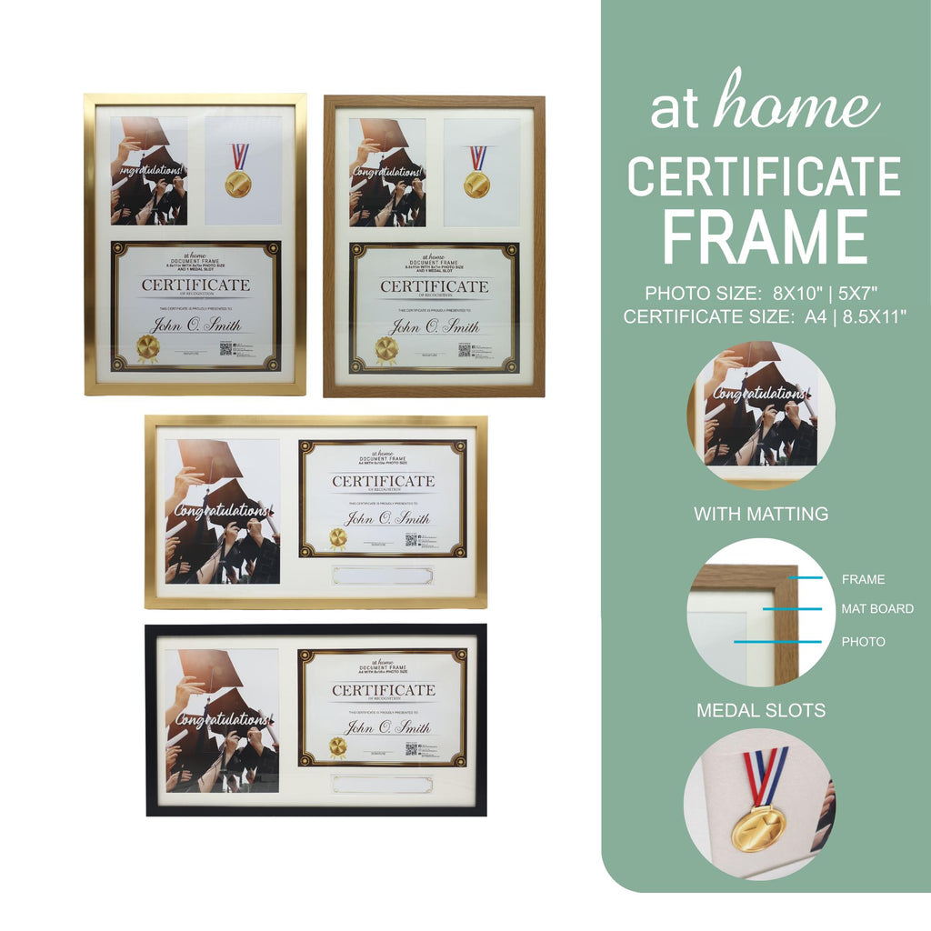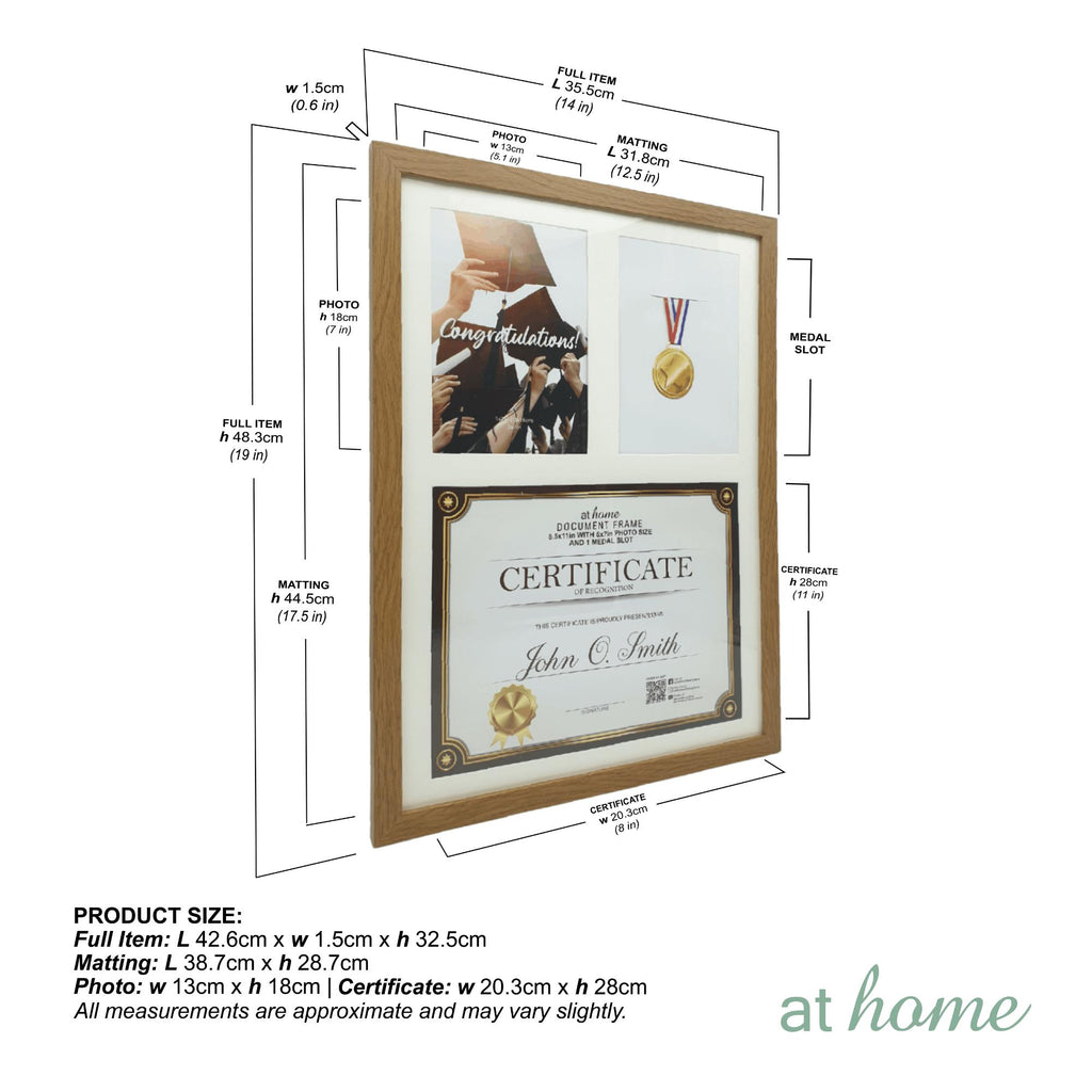 JENNY MEDAL & CERTIFICATE FRAME: Outer frame size is 14 x 0.6 x 19 in (35.5 x 1.5 x 48.3 cm). Matting size is 12.5 x 17.5 in (31.8 x 44.5 cm). Photo Opening of 5x7 in (13 x 18 cm). Certificate slot of 8 x 11 in (20.3 x 28 cm). The frame comes in Natural or Gold