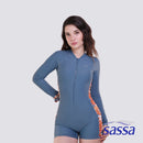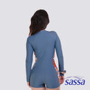 Rock the waves with confidence in the Sassa Pumpkin Delight One Piece Bodysuit, featuring UPF50+ fabric, removable pads, and a chic half-zip front for easy wear. Made from recycled fabric, this eco-friendly piece comes with a matching scrunchie for the perfect beach-ready look.