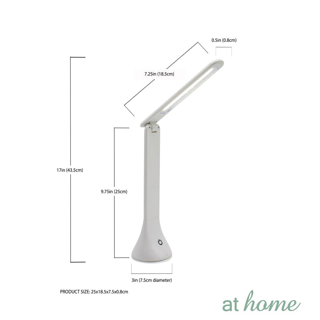SIZE AND COLORS: The lamp measures 17in (43.5 cm) high when open and (7.5 cm) wide. Comes in Dark Gray or White. Material is plastic.