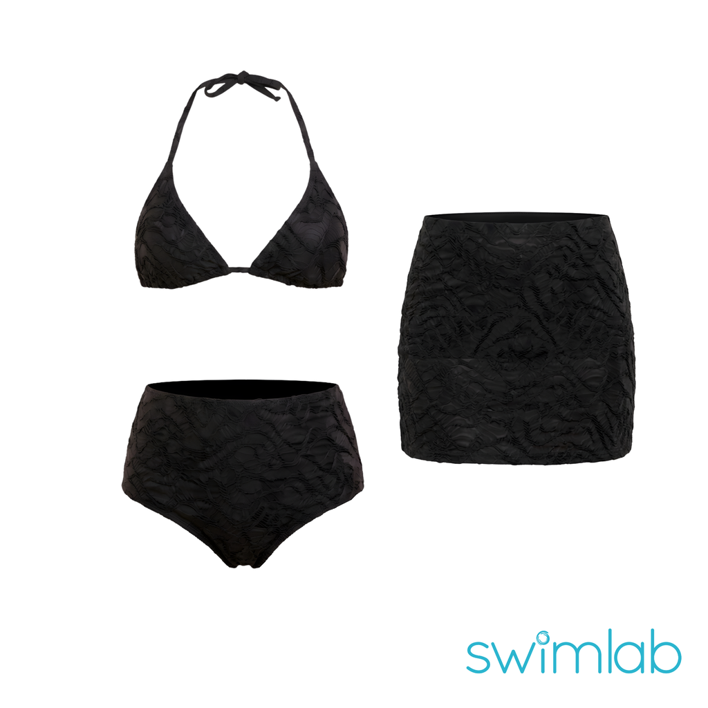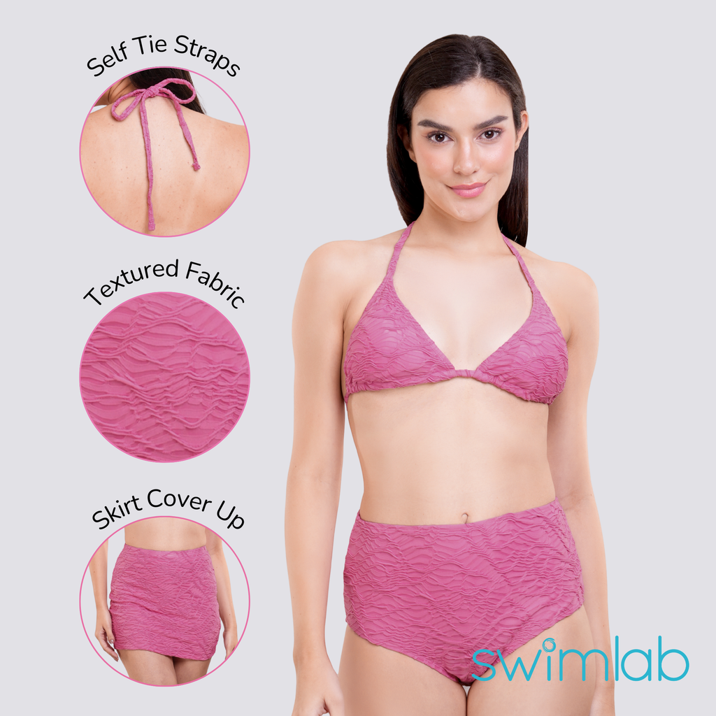 Feel confident, stylish, and comfortable in the Triangle Bikini Top Set, designed to flatter and move with you. The textured triangle top features soft lining, adjustable halter and back ties, and removable pads for customizable support, paired with a high-waist bottom with a smooth elastic waistband and full lining for secure, all-day comfort—made to fit beautifully. Finished with a matching textured skirt cover-up and packed in eco-friendly branded packaging, this set is perfect for women who love effortless beach style with a comfortable, polished feel.